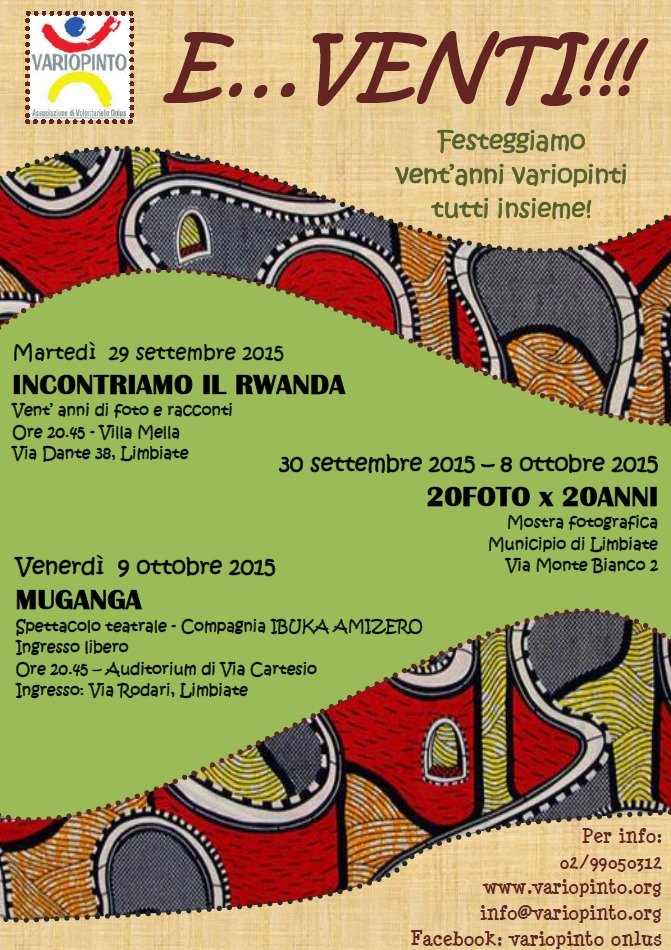 In occasione del suo ventesimo compleanno l’Associazione di volontariato ‘Variopinto Onlus‘, impegnata con diversi progetti in Rwanda, organizza una serie di interessanti appuntamenti, che rientrano nel ciclo E… Venti!!! Festeggiamo vent’anni variopinti tutti insieme! Tutti gli incontri si svolgeranno a Limbiate, comune nella provincia di Monza e della Brianza.