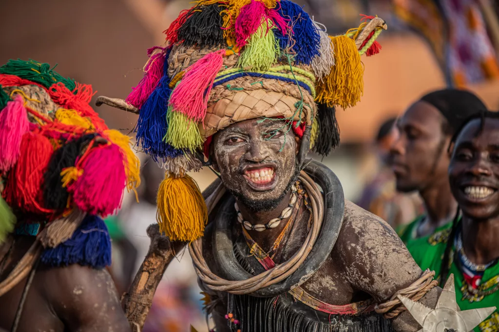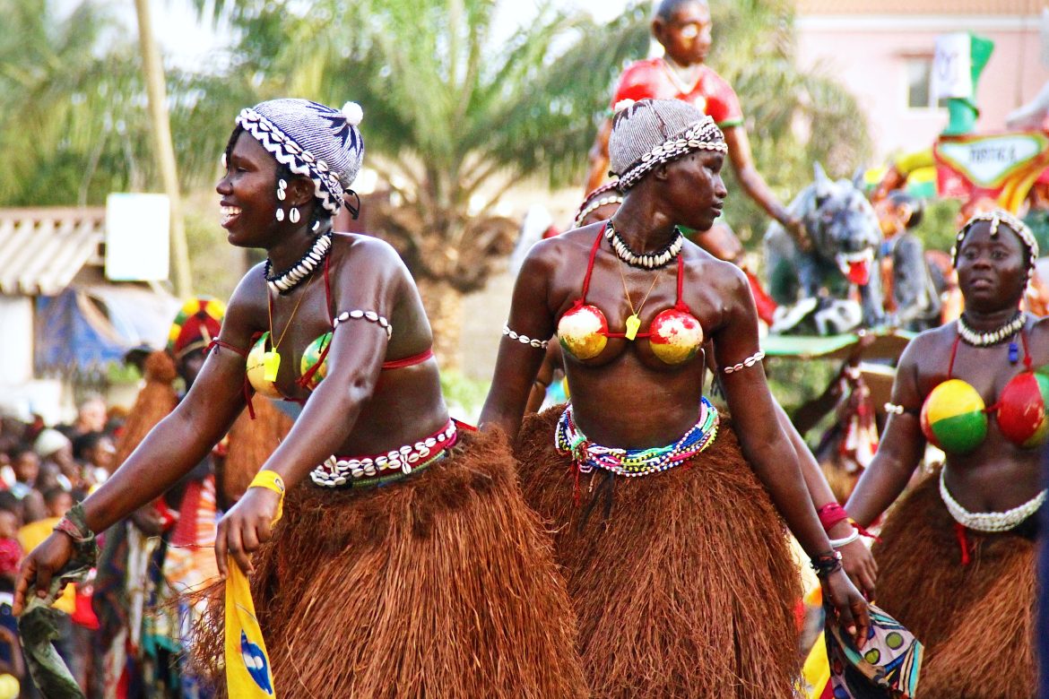 Vortici di corpi oleati e dipinti, costumi e ornamenti tipici, quali cavigliere di semi di mango o di palme intrecciate, veri e propri atleti che ballano incessantemente e acrobaticamente al ritmo dei tam-tam e della musica tradizionale, inframezzati dall’uscita di maschere moderne di cartapesta, satiriche verso la politica e i rappresentanti del potere nazionale.