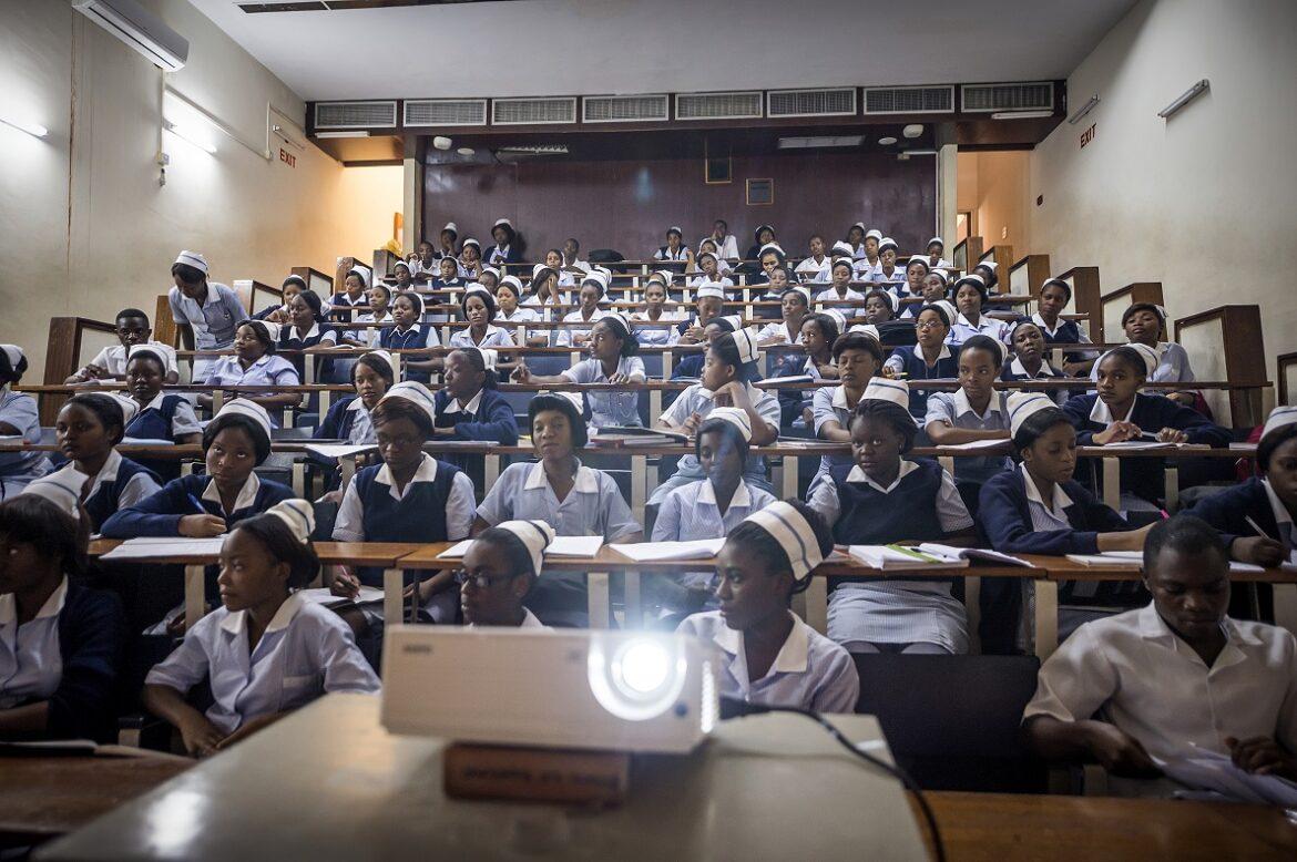 Allieve e allievi della Lusaka School of Nursing (Zambia) nell’aula magna. – Foto di Sven Torfinn / Panos