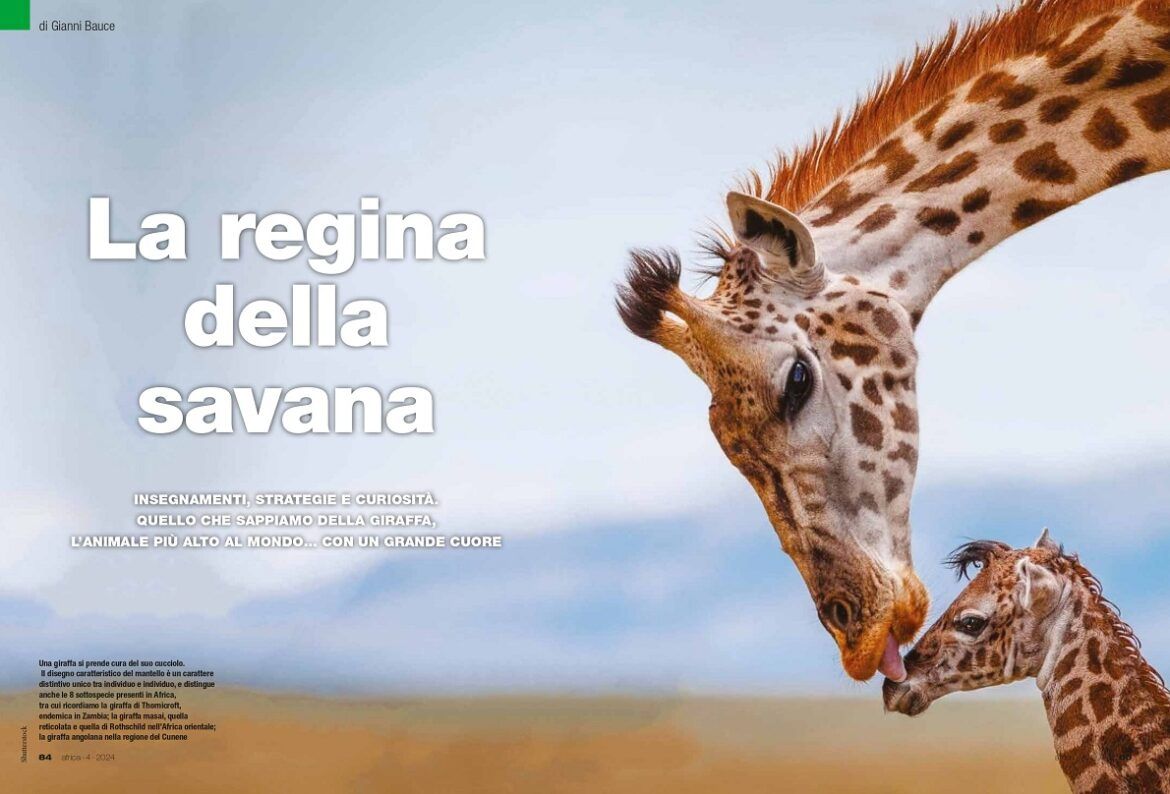 Una giraffa si prende cura del suo cucciolo. Il disegno caratteristico del mantello è un carattere distintivo unico tra individuo e individuo, e distingue anche le 8 sottospecie presenti in Africa, tra cui ricordiamo la giraffa di Thornicroft, endemica in Zambia; la giraffa masai, quella reticolata e quella di Rothschild nell’Africa orientale; la giraffa angolana nella regione del Cunene. – Copertina del servizio “La regina della savana” a firma di Gianni Bauce pubblicato sul numero di luglio-agosto della rivista Africa. Foto di Shutterstock