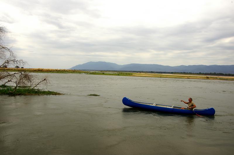 Gianni Bauce, fondatore di African Path Safari, in canoa sulle acque limacciose del fiume Zambesi.