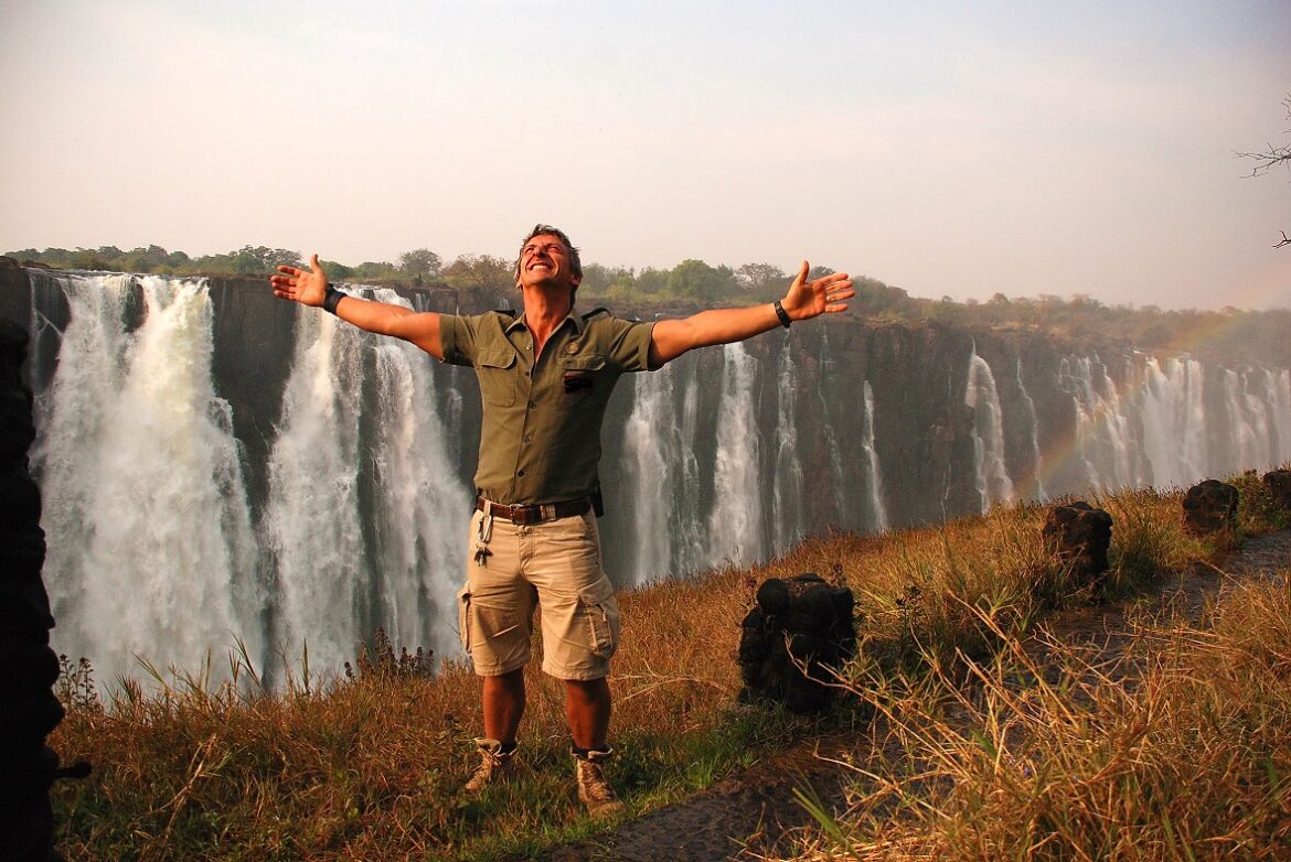 Davanti alle Victoria Falls, Gianni Bauce, esperto di fauna africana e guida del nostro viaggio in Zimbabwe.